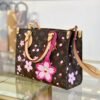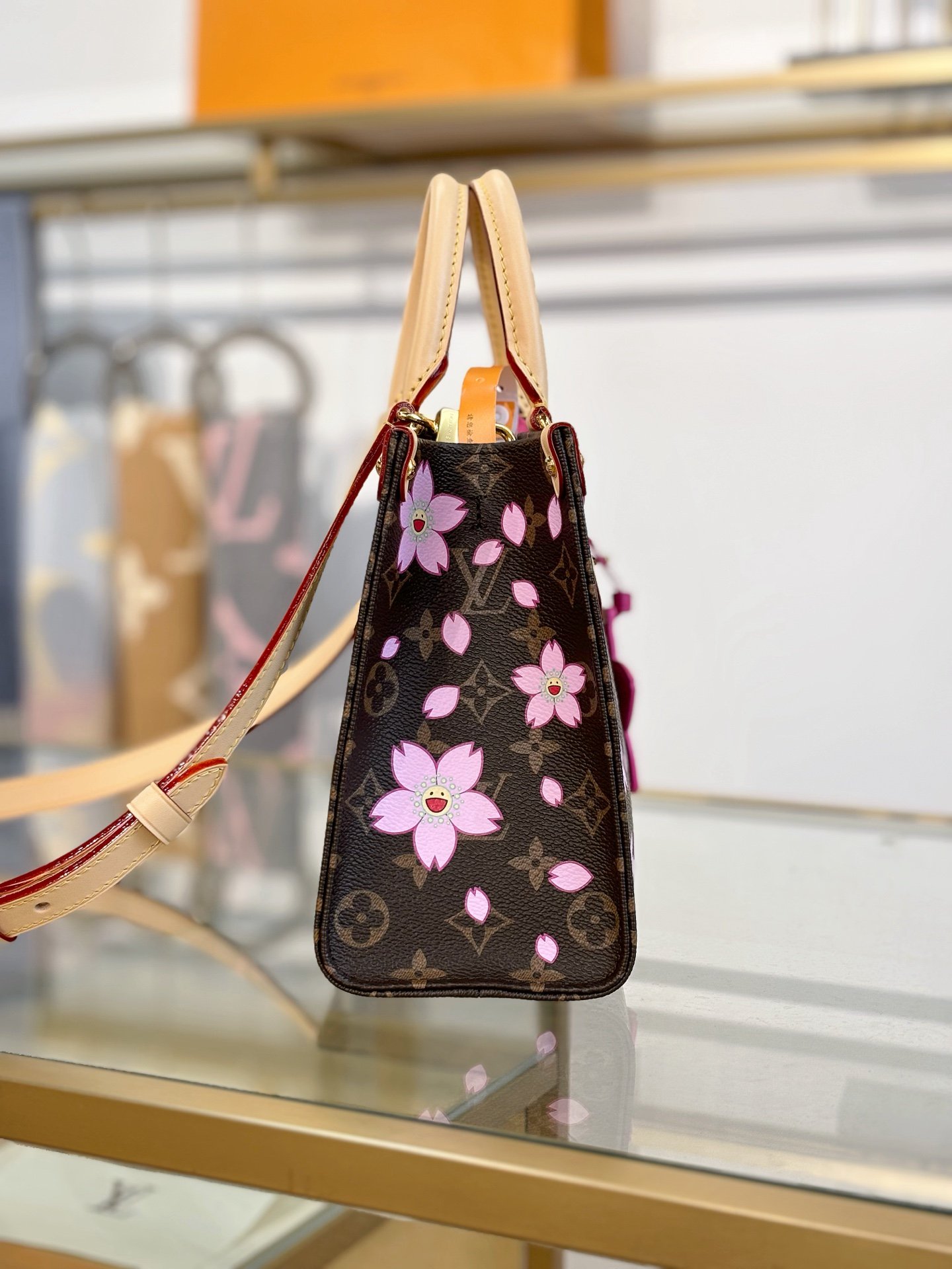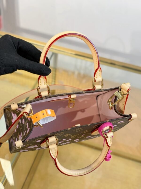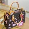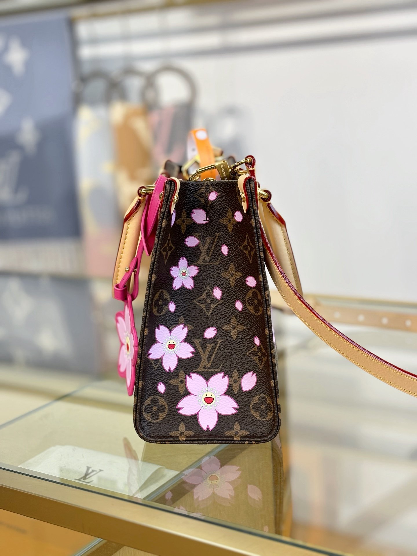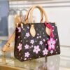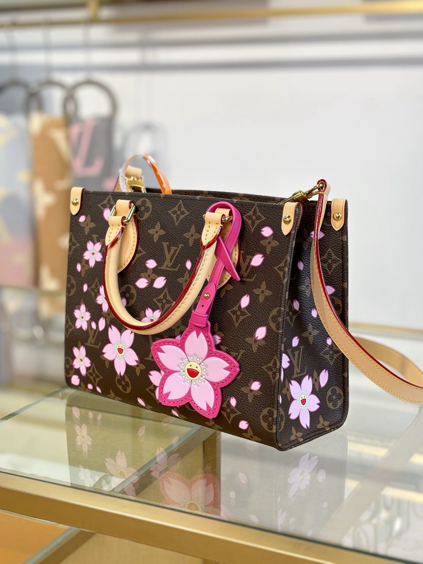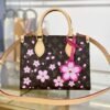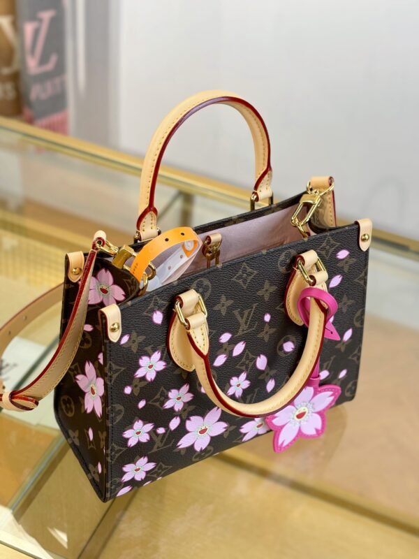 This timeless OnTheGo PM handbag is playfully refreshed with statement Cherry Blossom motifs from the exclusive re-edition of the Louis Vuitton x Murakami collection. Symbolizing renewal, the Japanese artist’s vibrant floral motifs are printed over the House’s iconic Monogram coated canvas, while natural cowhide leather trims and golden hardware complete the look. A removable Cherry Blossom charm adds a final seasonal flourish.