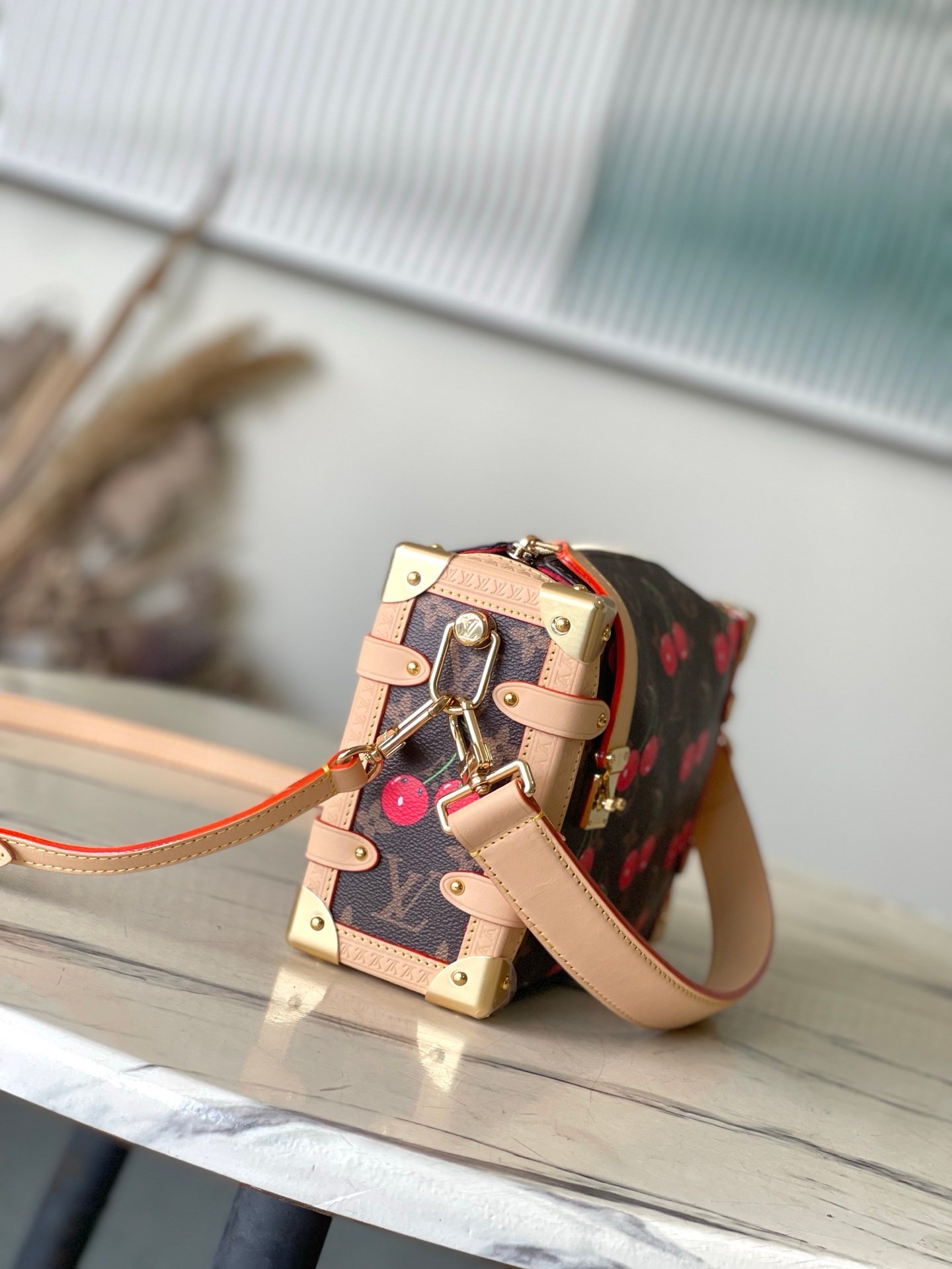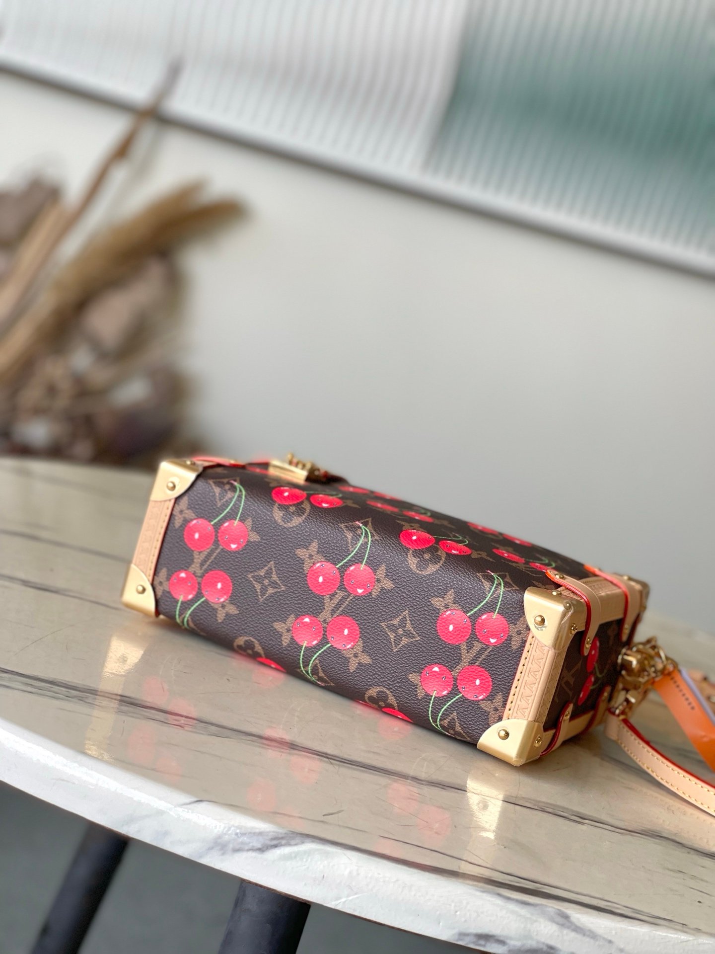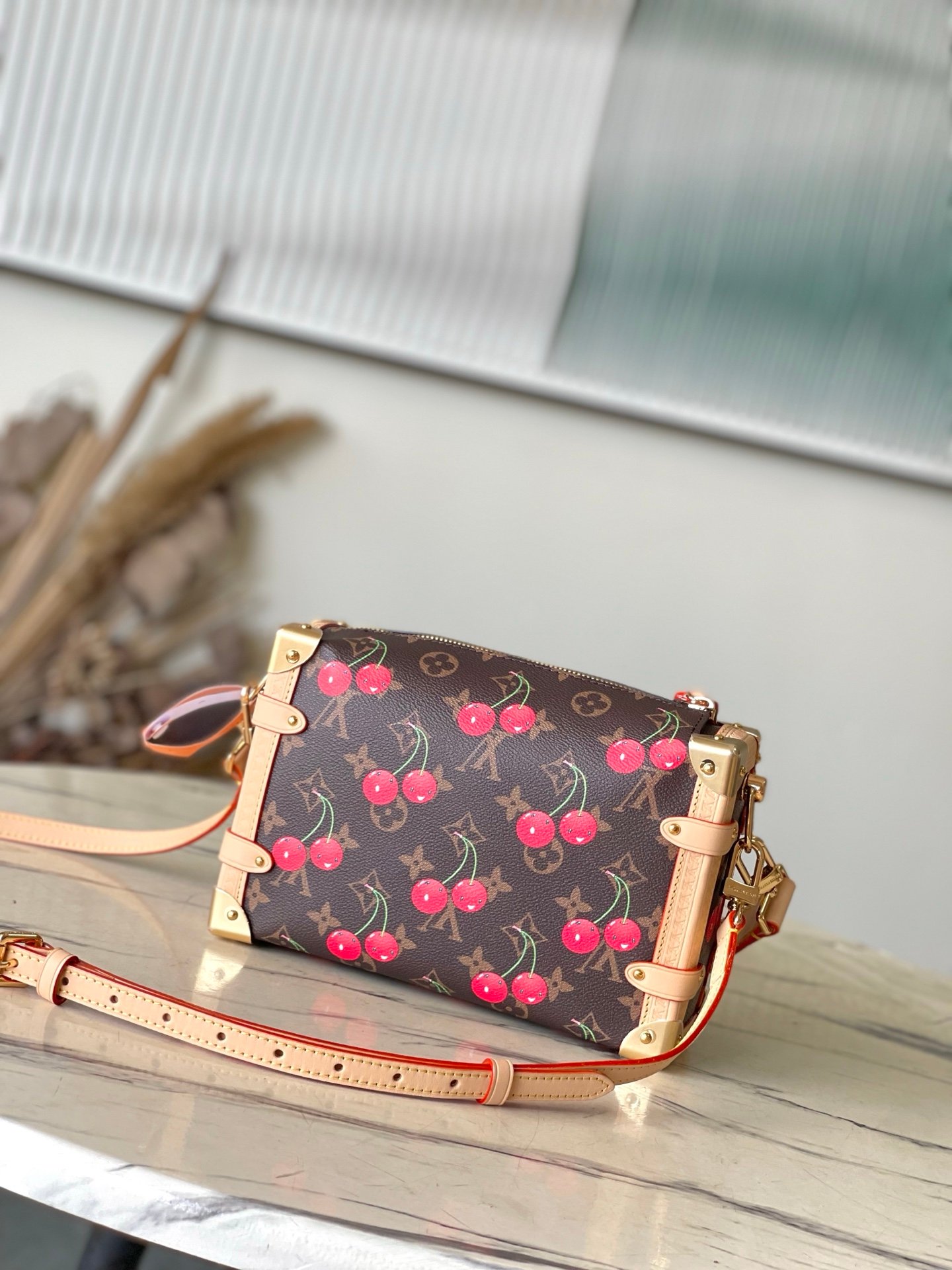 Reflecting the playful spirit of the celebratory re-edition of the Louis Vuitton x Murakami collection, the Side Trunk MM is crafted from classic Monogram coated canvas adorned with luscious cherry motifs in the Japanese artist’s exuberant aesthetic. Natural cowhide leather trims and golden hardware pay homage to the House’s travel heritage, including riveted corners and an S-lock closure.