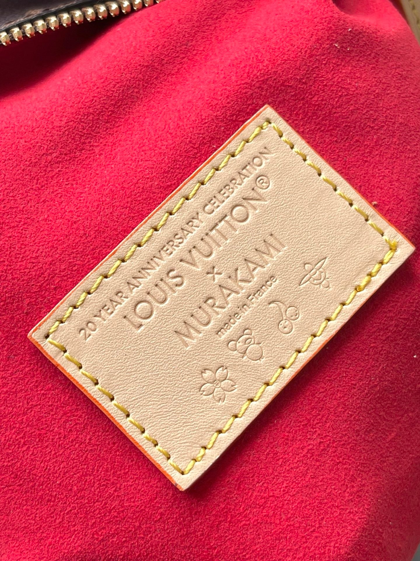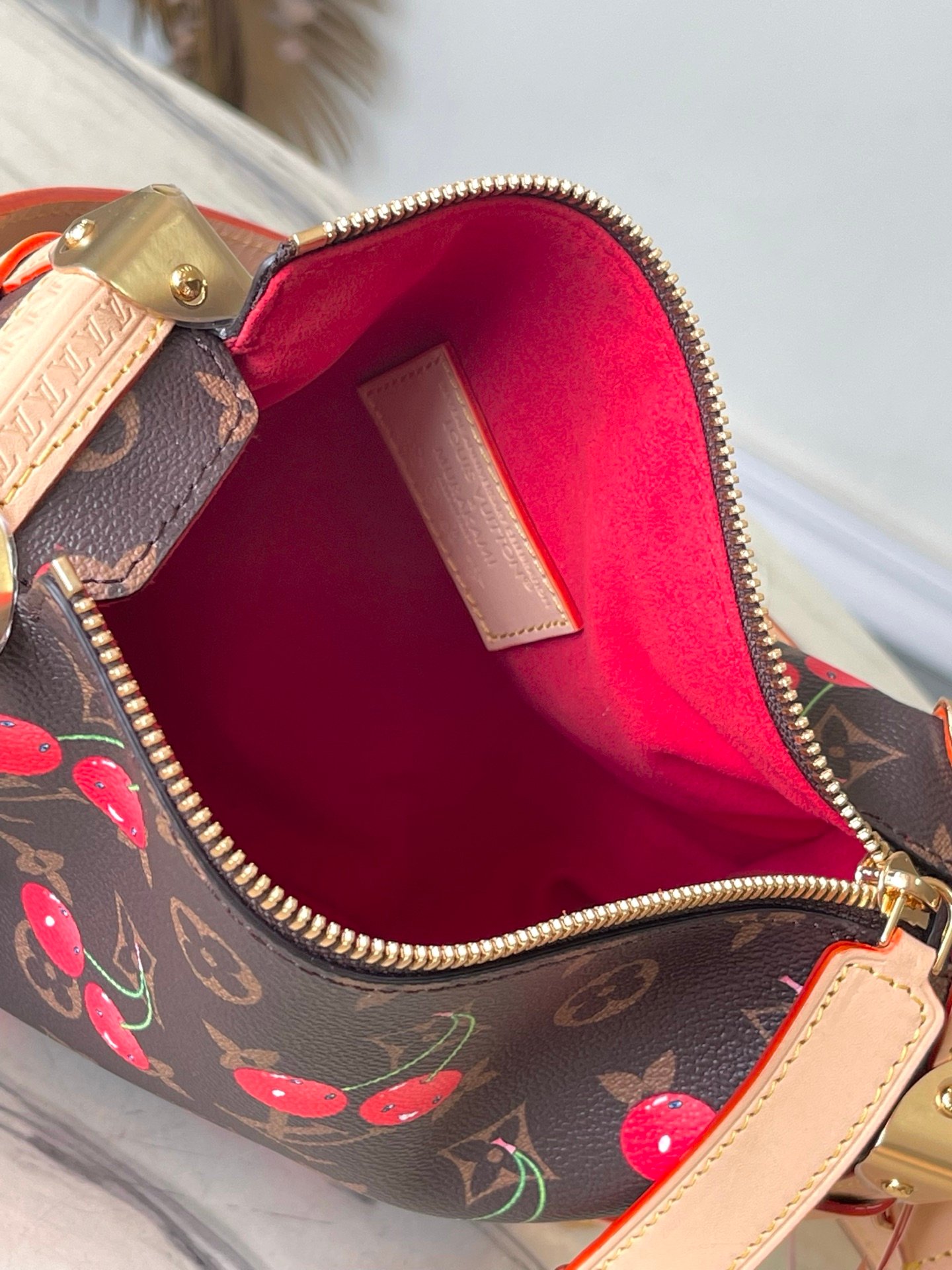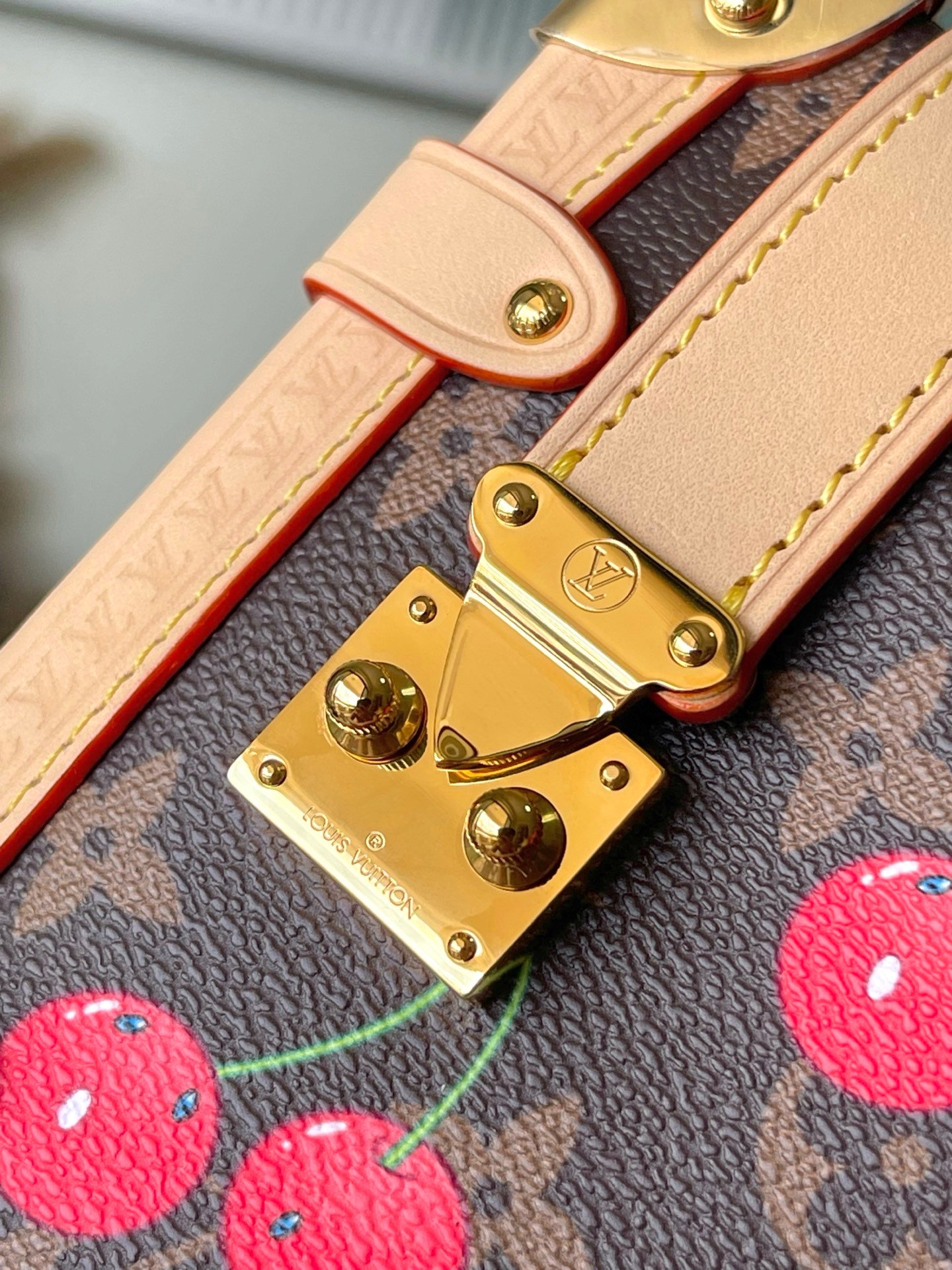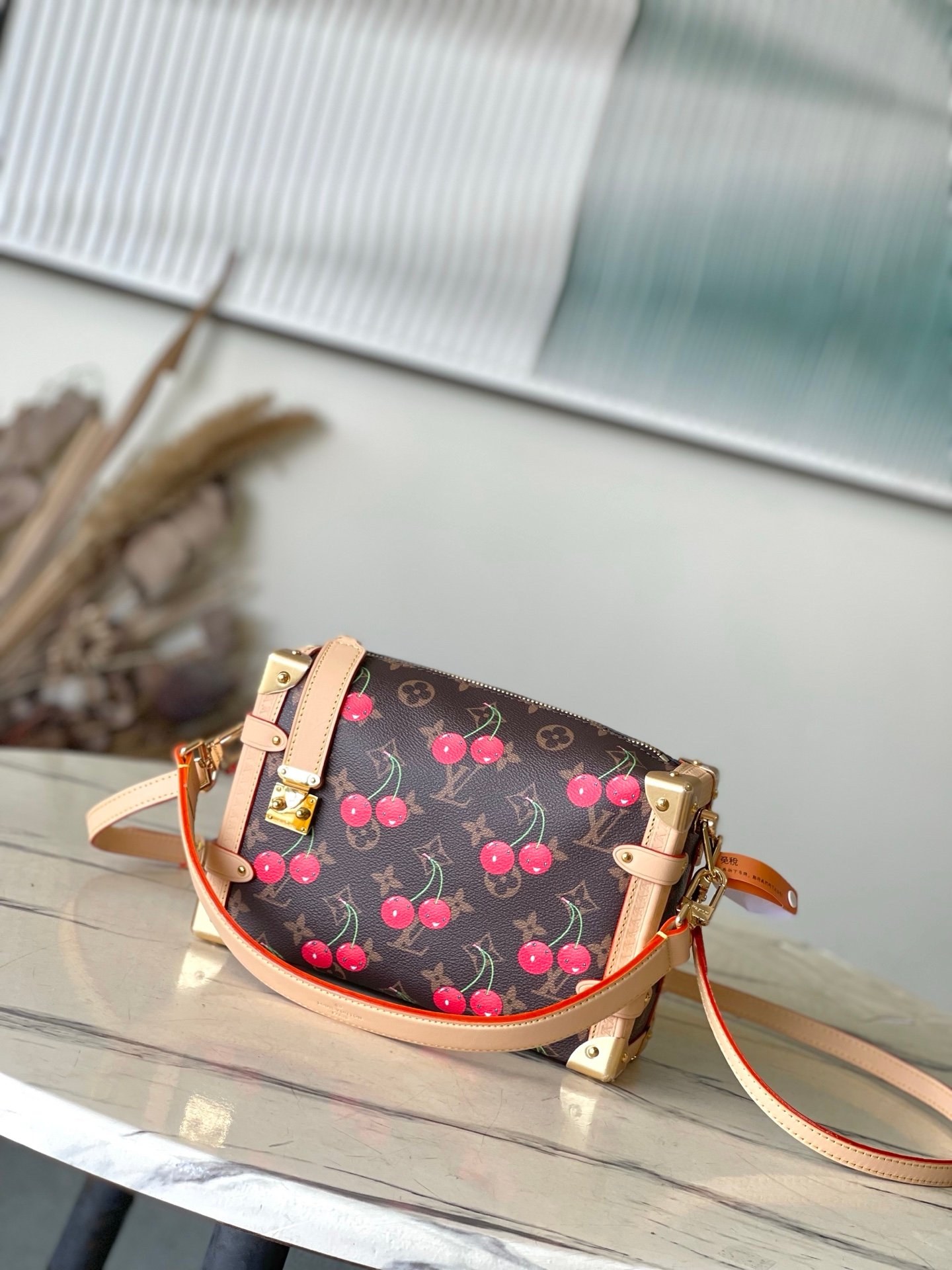 Reflecting the playful spirit of the celebratory re-edition of the Louis Vuitton x Murakami collection, the Side Trunk MM is crafted from classic Monogram coated canvas adorned with luscious cherry motifs in the Japanese artist’s exuberant aesthetic. Natural cowhide leather trims and golden hardware pay homage to the House’s travel heritage, including riveted corners and an S-lock closure.